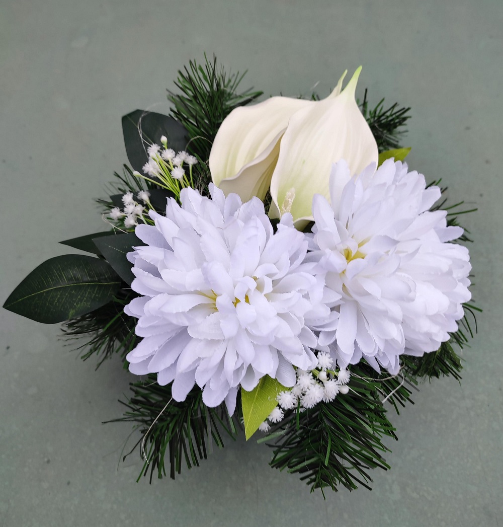 Úvod » HALLOWEEN, DUŠIČKY » Aranžmány a vence na hroby » Dušičkový aranžmán biely 30 cm