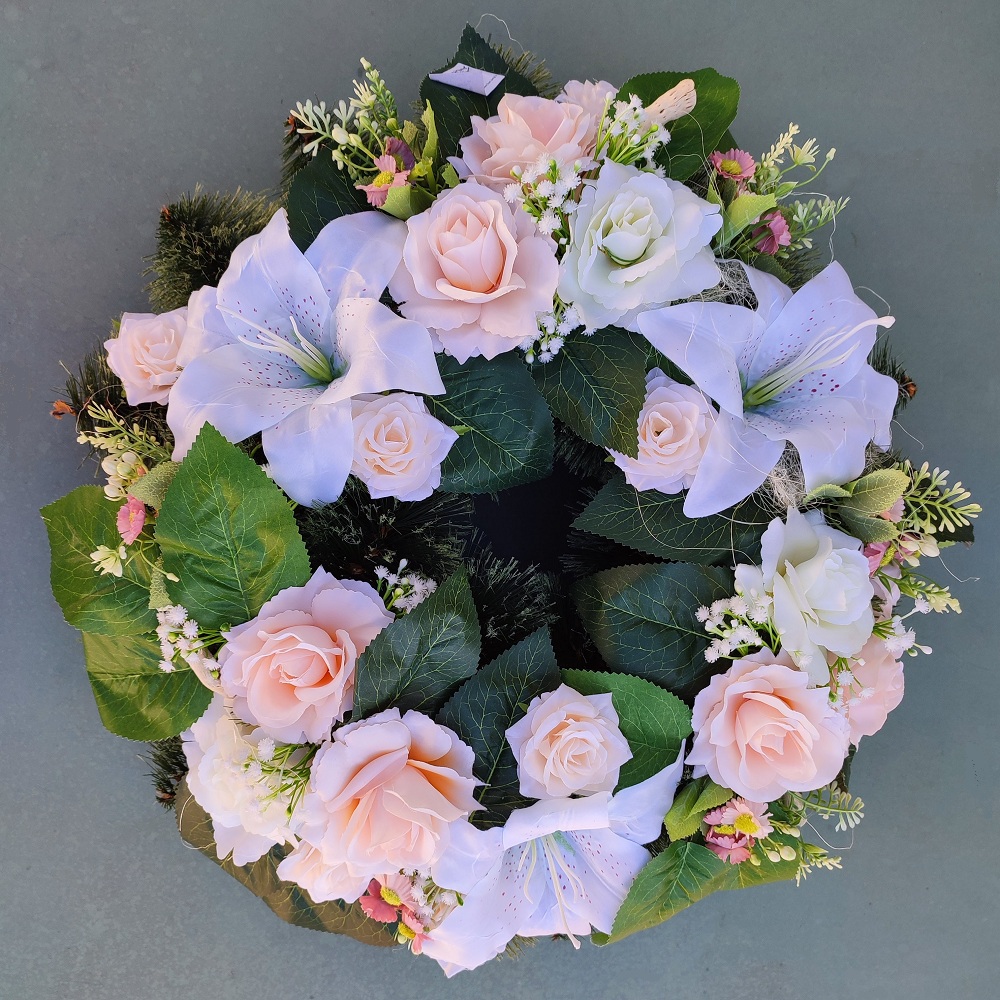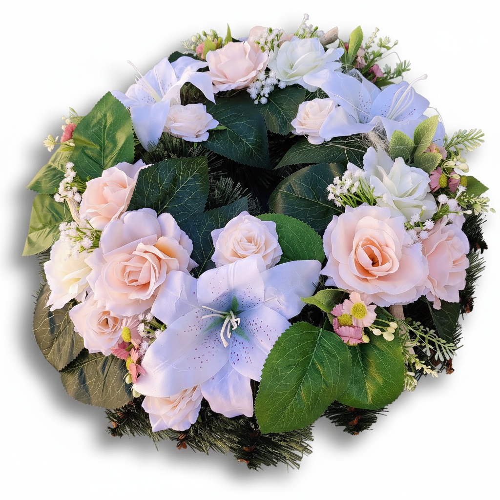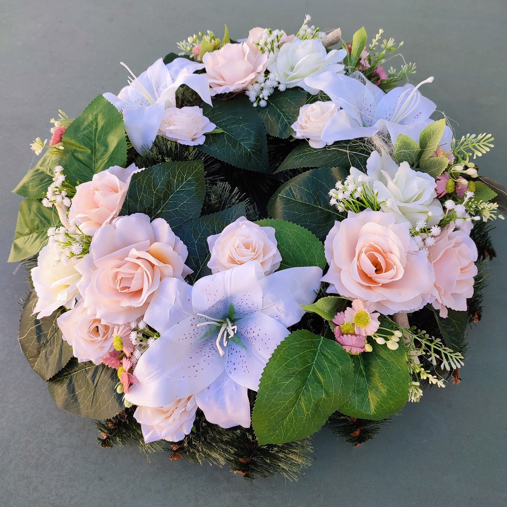 Úvod » HALLOWEEN, DUŠIČKY » Aranžmány a vence na hroby » Exkluzívny smútočný veniec 60 cm