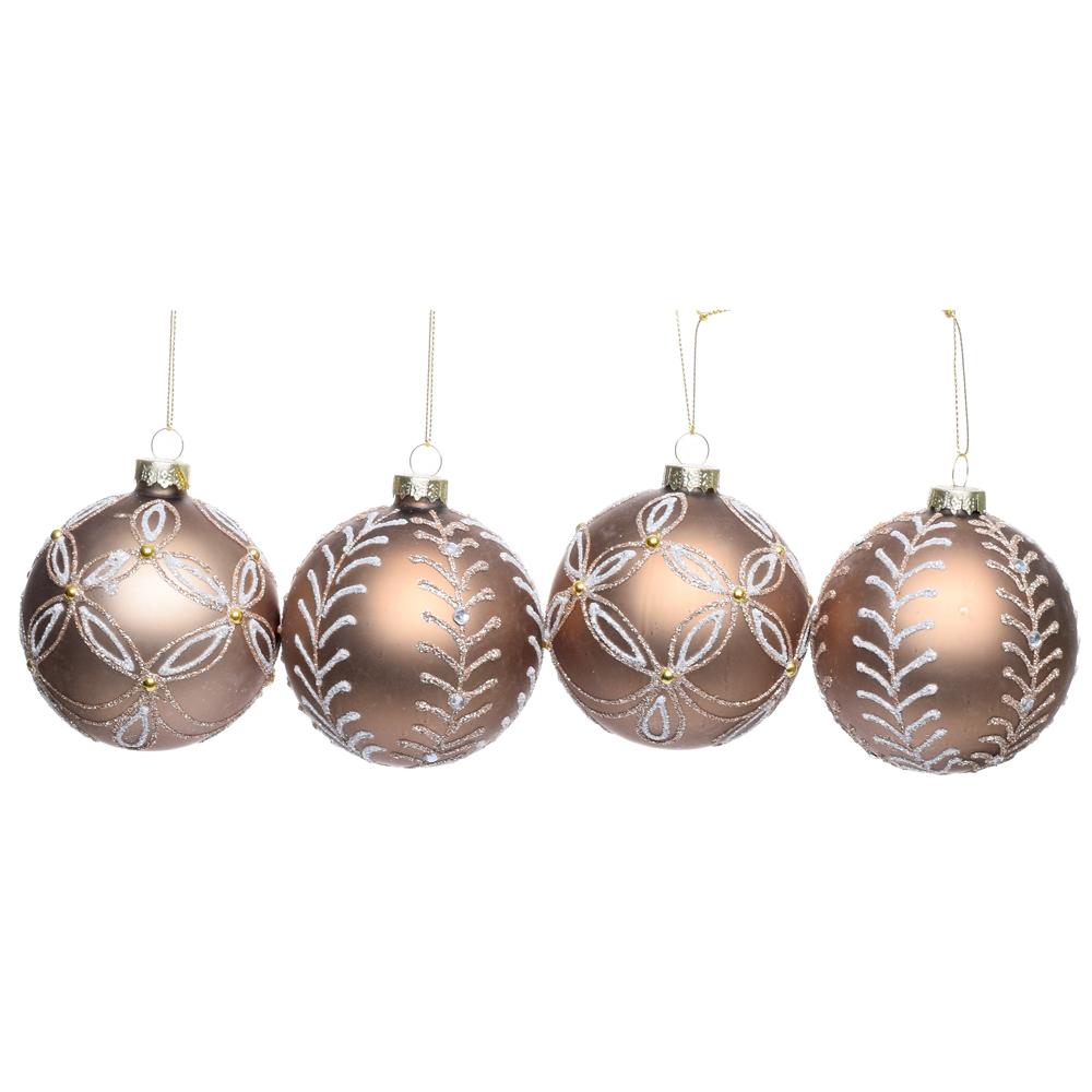 Nádherné sklenené vianočné gule na stromček. Vianočné gule zo skla v mixe hnedých, bielych a zlatých vzorov. Každá guľa má jedinečný dizajn, ktorý dodá stromčeku elegantný vzhľad. S priemerom 8 cm sú dostatočne veľké, aby na stromčeku upútali. V balení 4 ks, cena za balenie.