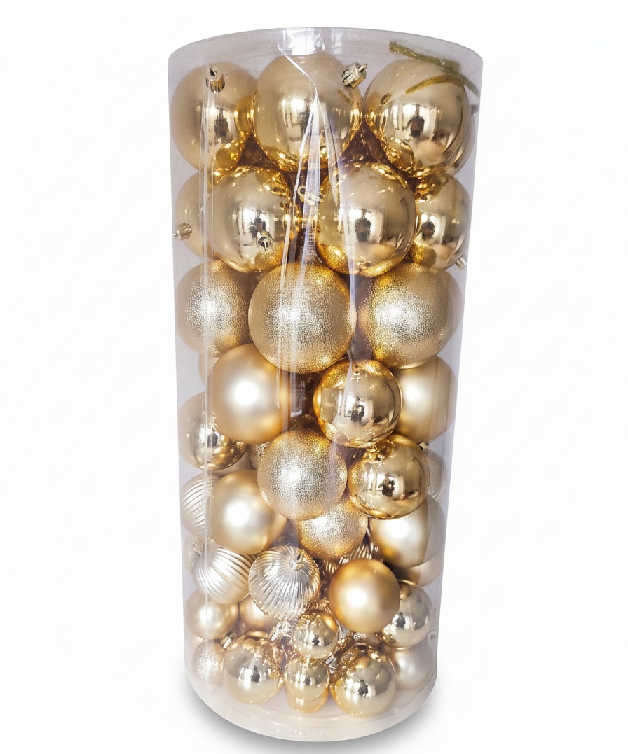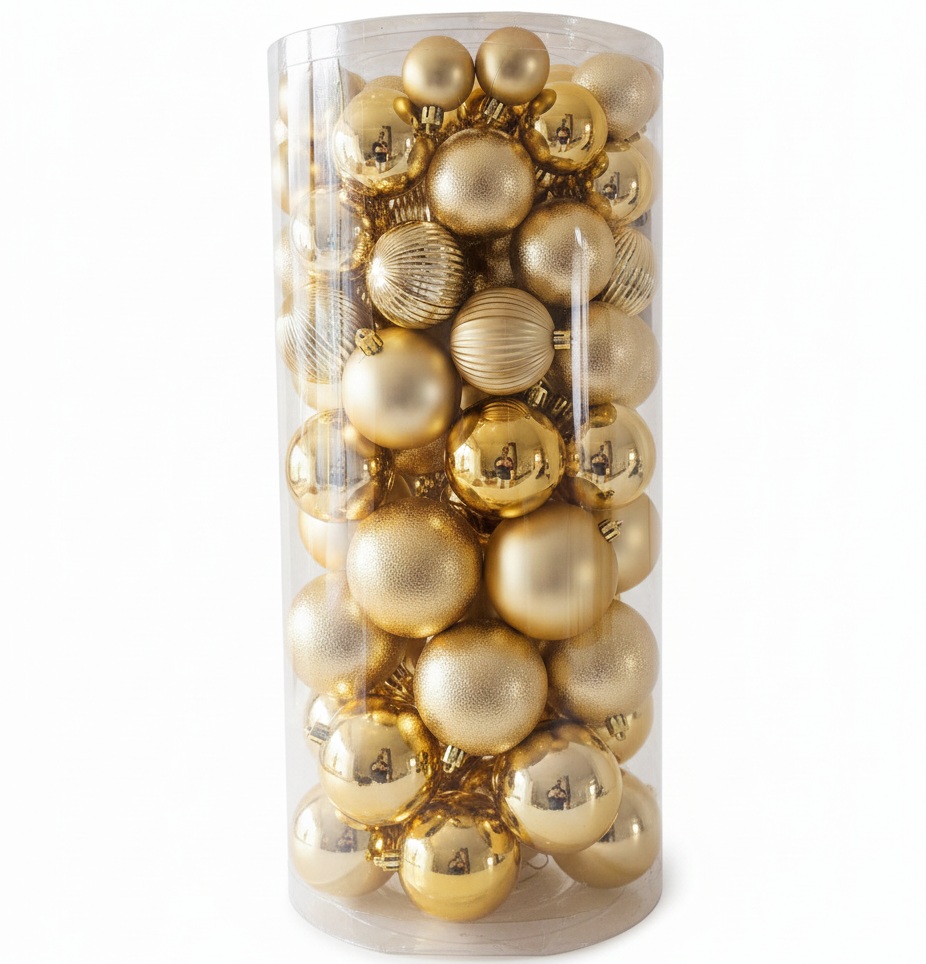 Rozžiarte svoj vianočný stromček veľkým setom zlatých vianočných gulí. 100 ks zlatých gulí na stromček, ktoré dodajú vašej výzdobe elegantný vzhľad. Set obsahuje mix veľkostí 8 - 4 cm, pričom väčšina gúľ je v rozmere 8 - 6 cm v rôznych povrchových úpravách – od lesklých a matných až po trblietavé, textúrované a vrúbkované, čo na stromčeku vytvorí krásny vizuálny efekt. Táto veľká sada je ideálnym riešením pre kompletnú a dokonale zladenú sviatočnú výzdobu. Rozmer setu je 50 x 25 cm. Kvalitné spracovanie.