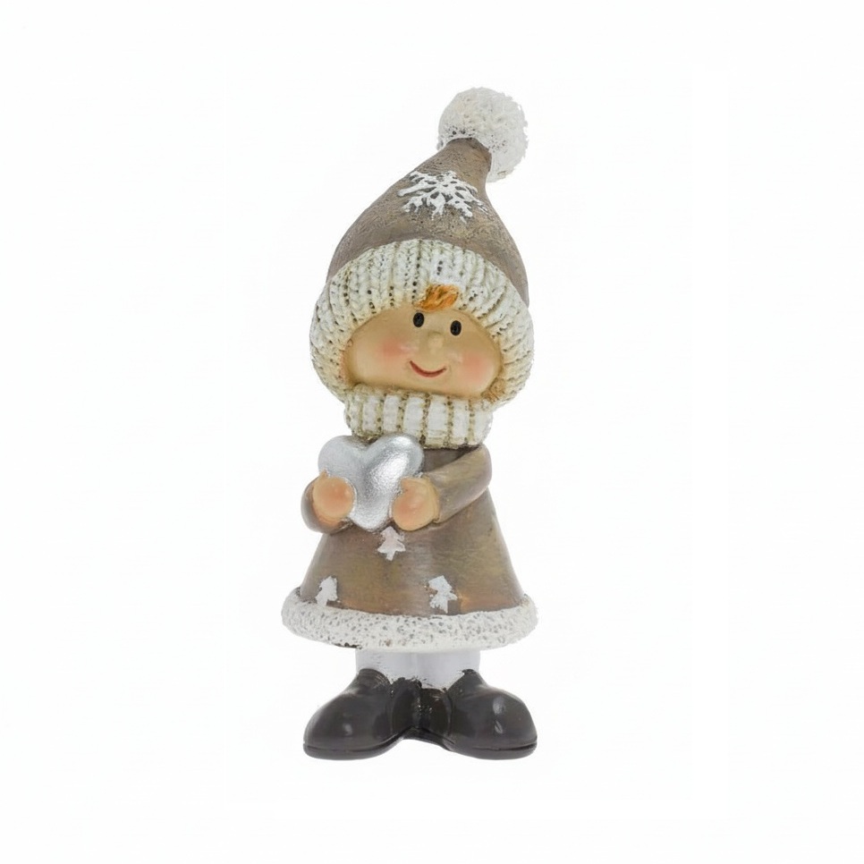 Krásna vianočná dekorácia dievča so srdiečkom. Je ideálna do vianočných aranžmánov alebo ako súčasť vianočnej výzdoby na stole, poličke alebo stromčeku. Detailne prepracované, materiál polyrezín. Rozmer 8,5 x 3,5 x 3 cm.