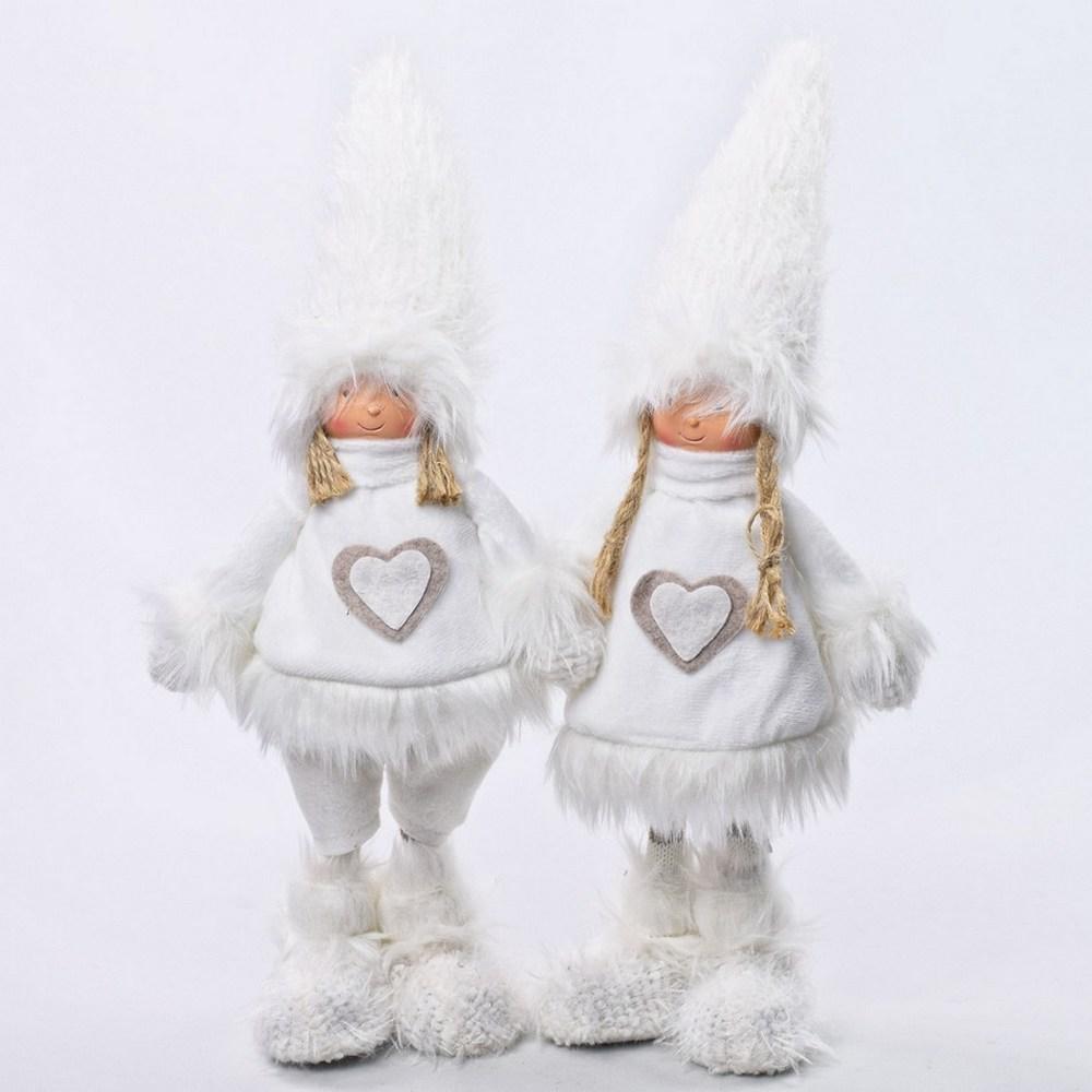 Nádherná vianočná dekorácia luxusné zimné sediace dievčatko s visiacimi nohami. Vianočné dievčatko je oblečené v štrikovanej čiapke, svetríku a doplnkoch bielej, krémovej, champagne a zlatej farby. Kvalitné spracovanie, celková dĺžka 59 cm.
