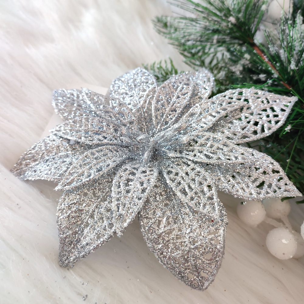 Úvod » VIANOČNÉ GULE A OZDOBY » Vianočná ruža poinsetia strieborná 15 cm