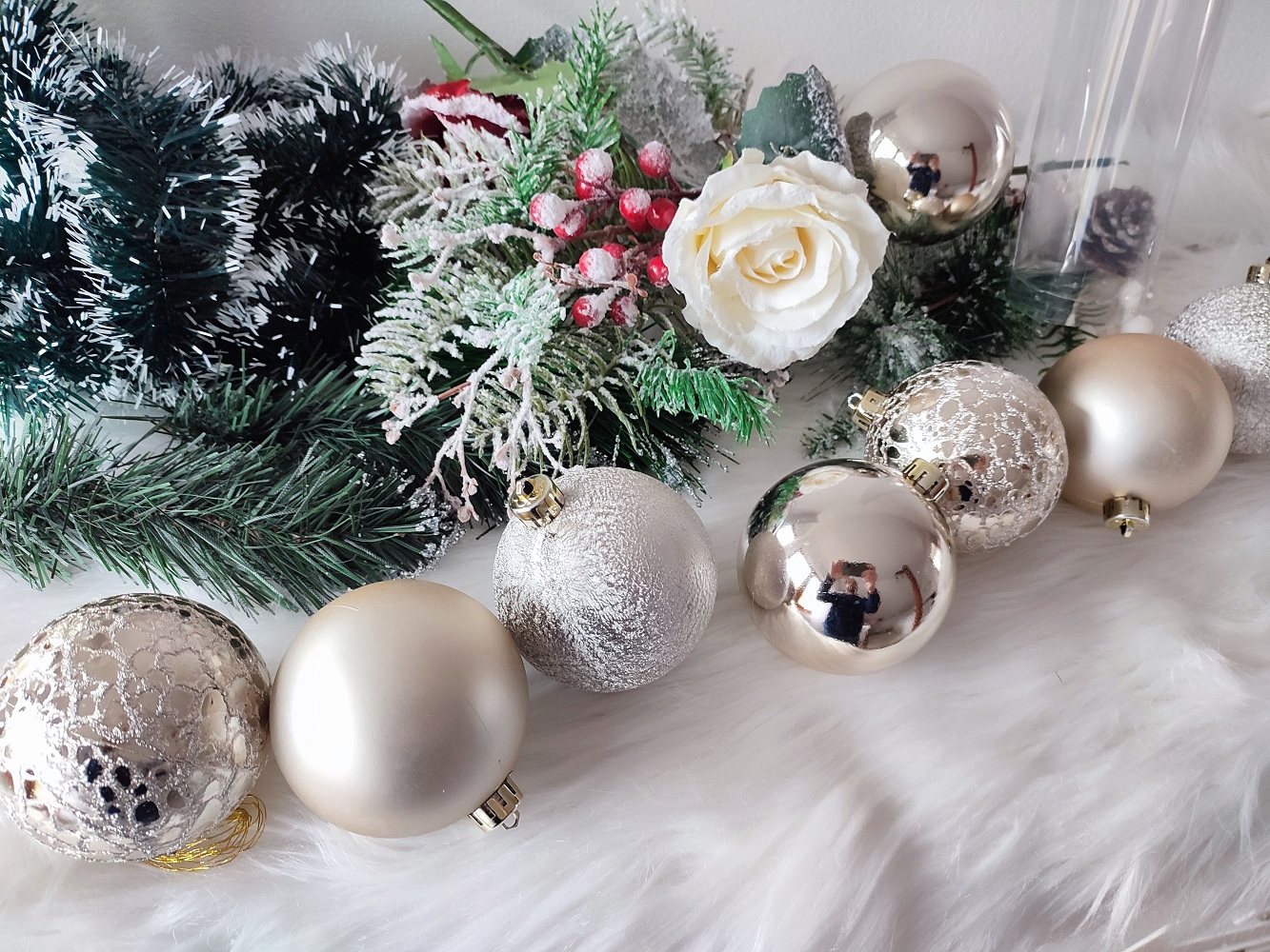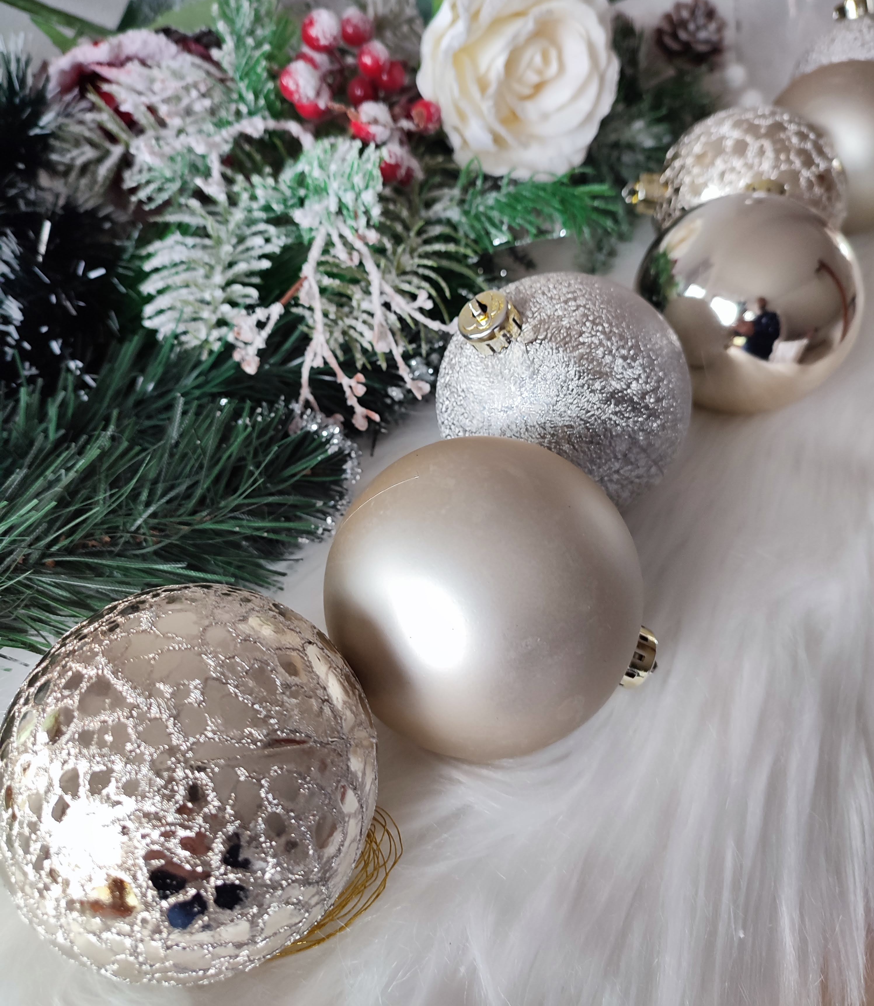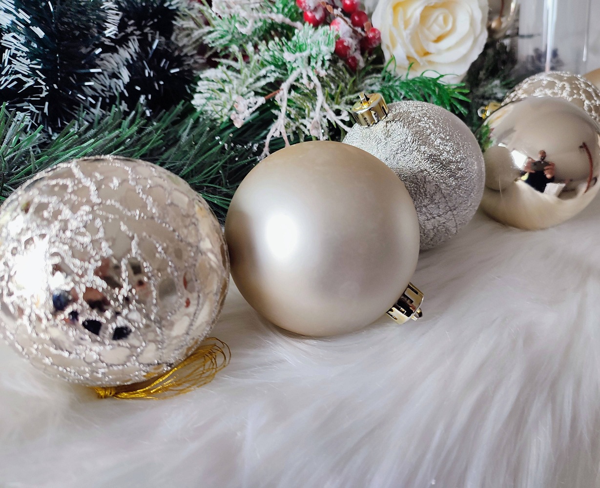 Krásne vianočné ozdoby veľké champagne gule na stromček. V balení mix 4 druhy gúľ, perlové, lesklé, trblietavé a námraza. S priemerom 8 cm sú dostatočne veľké, aby upútali pozornosť a ideálne na zdobenie vianočného stromčeka. Balenie 8 ks.