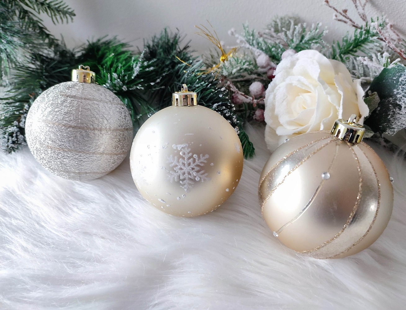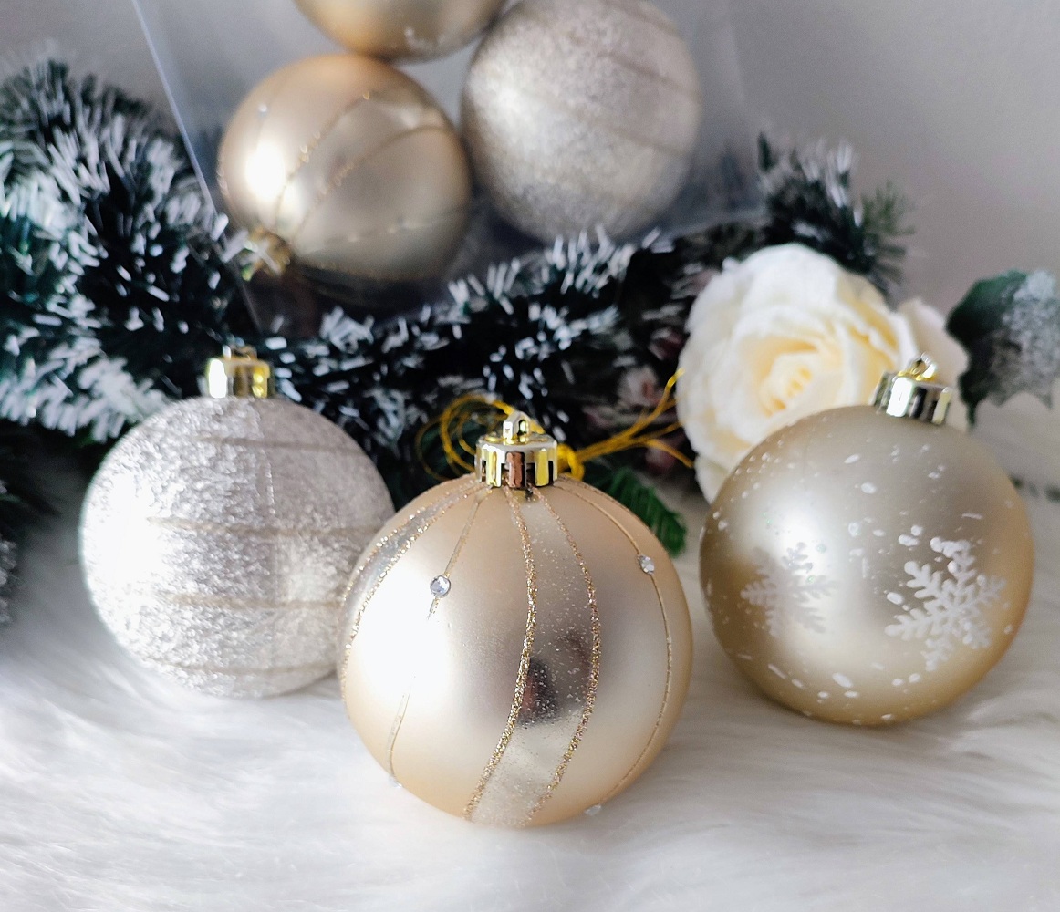 Krásne zlaté champagne vianočné ozdoby gule na stromček. V balení 3 druhy prevedenia, s ornamentmi a perličkami, trblietavé a s dekorom vločky. Vzory im dodávajú jedinečný štýlový a elegantný vzhľad. S priemerom 8 cm sú dostatočne veľké, aby upútali pozornosť a ideálne na zdobenie vianočného stromčeka. Balenie 6 ks. So šnúrkou na zavesenie.