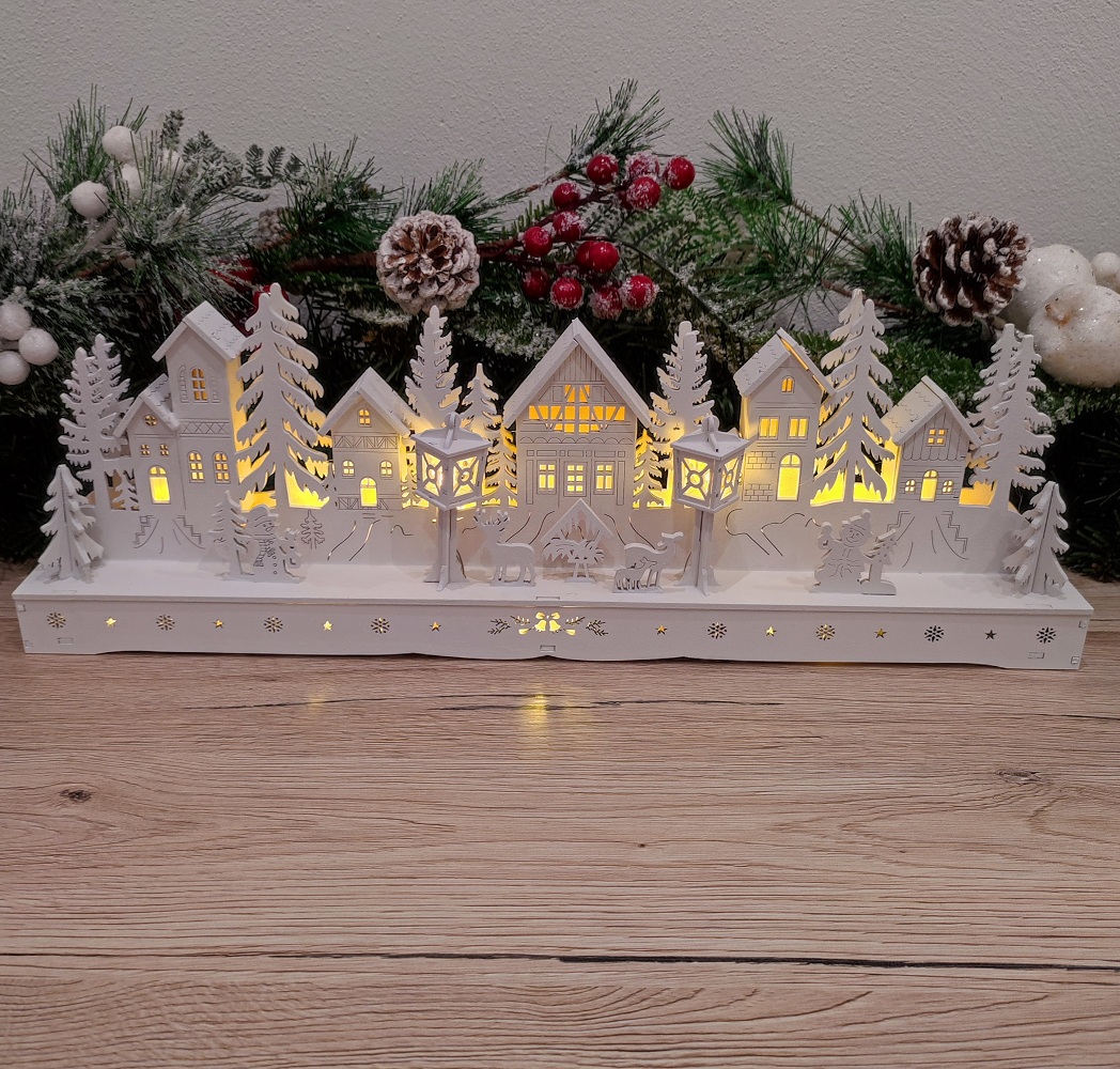 Nádherná vianočná dekorácia zasnežená polyrezinová LED dedinka na spôsob perníkov, svietiaca teplým bielym svetlom dodá vášmu domovu útulnú atmosféru. Je ideálna na zimnú výzdobu stola, parapetnej dosky na okne alebo poličky.